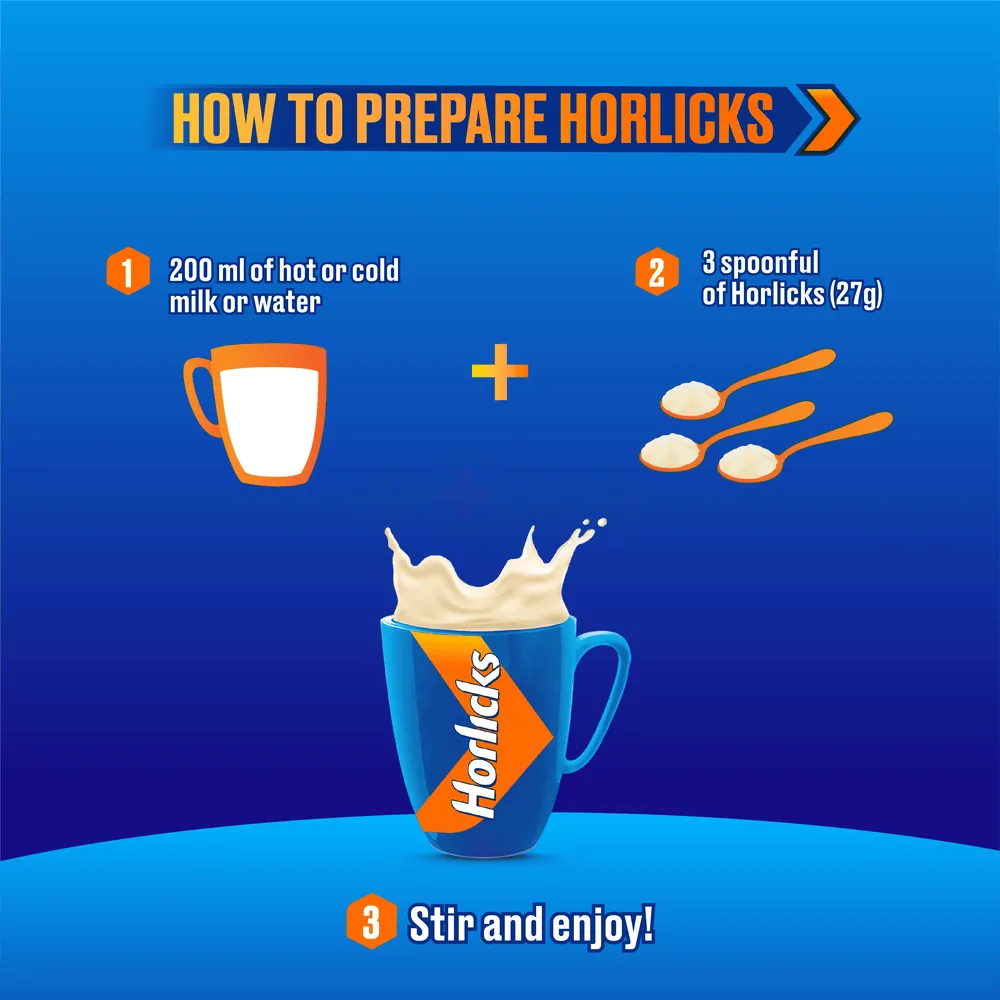 1. Add 3 heaped spoonfuls (approximately 30g) of Horlicks to 200ml of hot or cold milk.